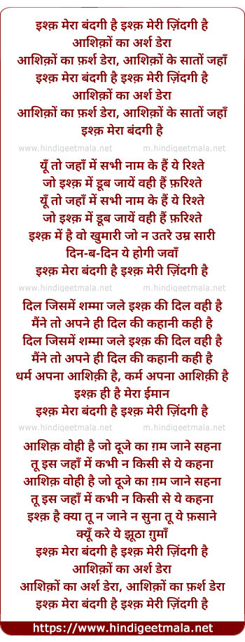 Lyrics of Ishq Mera Bandagi Hai Ishq Meri Zindgi Hai - इश्क़ मेरा बंदगी है इश्क़ मेरी ज़िंदगी है