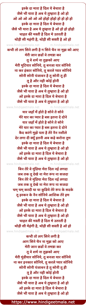 Lyrics of Ishqe Da Mara Hai Dil Ye Bechara Hai - इश्के दा मारा है दिल ये बेचारा है