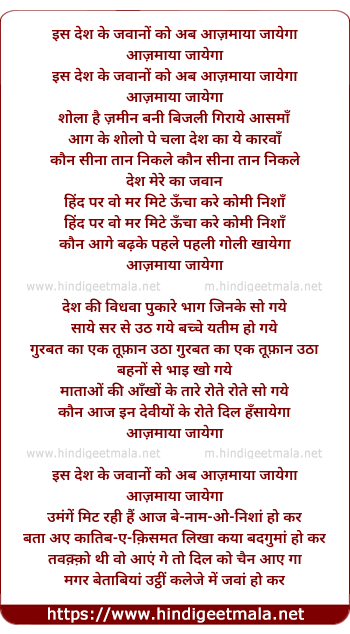Lyrics of Iss Desh Ke Jawano Ko Abb Aajmaya Jayega - ( इस देश के जवानों को अब आज़माया जायेगा