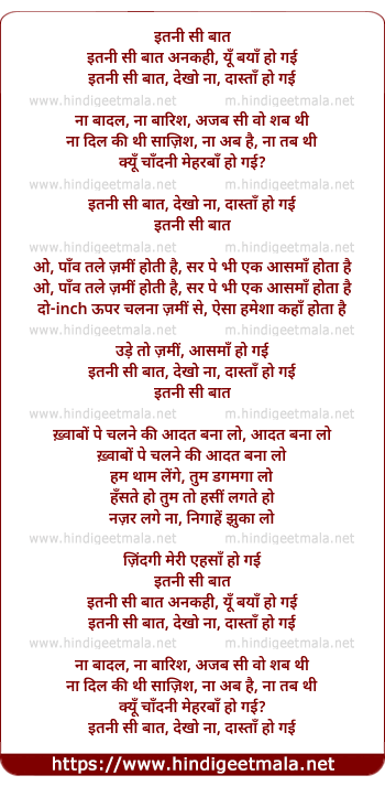 Lyrics of Itni Si Baat Ankahi Yun Bayaan Ho Gayi - इतनी सी बात अनकही यूँ बयान हो गई