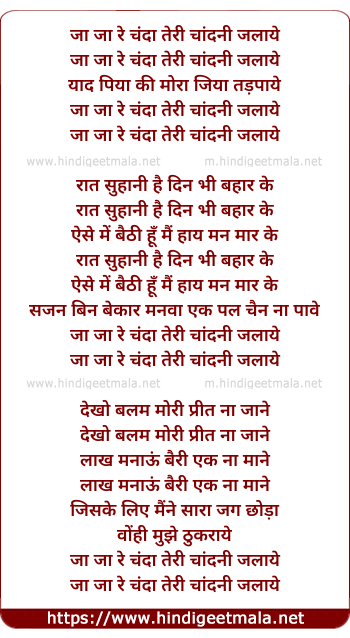 Lyrics of Ja Ja Re Chanda Teri Chandni Jalaye - जा जा रे चंदा तेरी चांदनी जलाये
