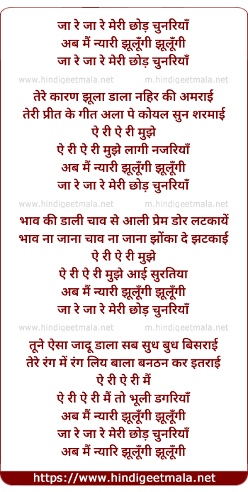 Lyrics of Ja Re Ja Re Meri Chhod Chunariya - जा रे जा रे मेरी छोड़ चुनरियाँ