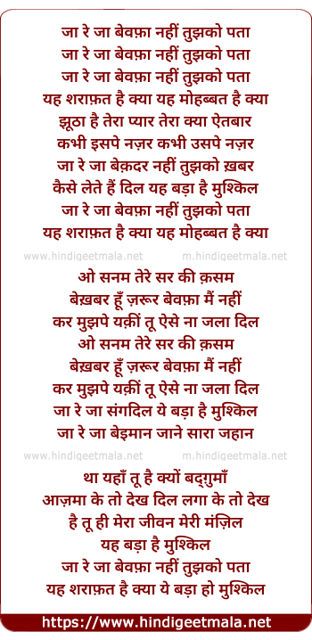 Lyrics of Ja Re Jaa Bewafa, Nahi Tujhko Pata, Yeh Sarafat Hai Kya Yeh Mohabbat Hai Kya - जा रे जा बेवफ़ा, नहीं तुझको पता, ये सराफत है क्या मोहब्बत है क्या