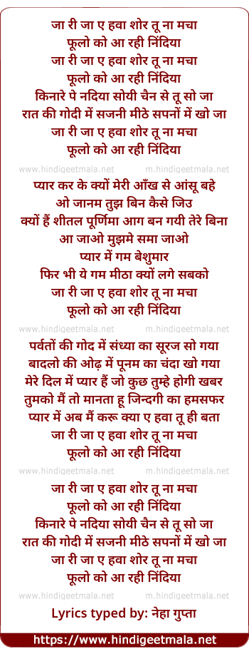 Lyrics of Ja Ri Ja Ai Ha Shor Tu Na Macha - जा री जा ए हवा शोर तू ना मचा