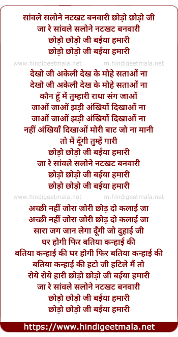 Lyrics of Jaa Re Saanwale Salone Natkhat Banwaari - जा रे सांवले सलोने नटखट बनवारी