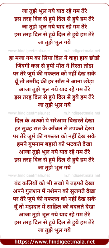 Lyrics of Jaa Tujhe Bhool Gaye - जा तुझे भूल गये याद रहे गम तेरे