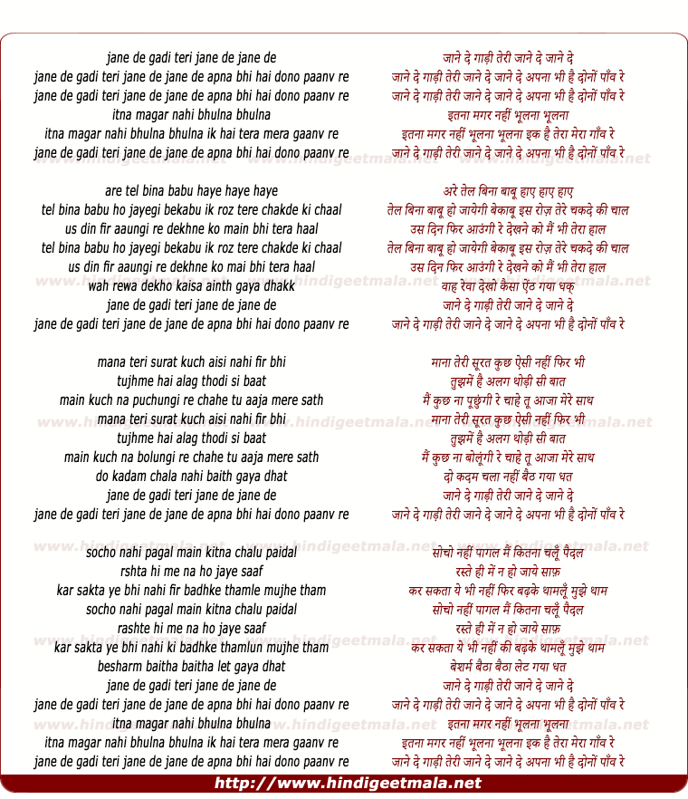 Lyrics of Jaane De Gaadi Teri Jane De, Apna Bhi Hai Dono Paanv Re - जाने दे गाड़ी तेरी जाने दे, अपना भी है दोनों पाँव रे