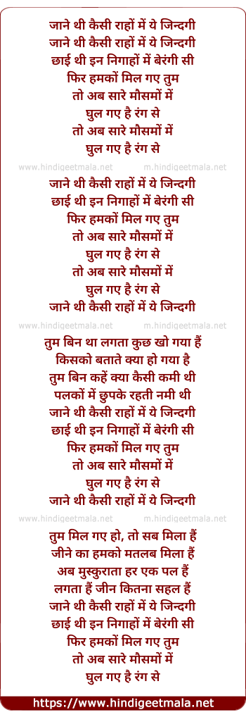 Lyrics of Jane Thi Kaisi Raho Mein Ye Jindagi - जाने थी कैसी राहों में ये जिन्दगी