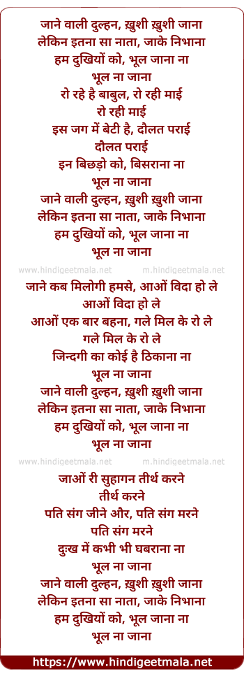 Lyrics of Jaane Wali Dulhan Khushi Khushi Jaana - जाने वाली दुल्हन, ख़ुशी ख़ुशी जाना