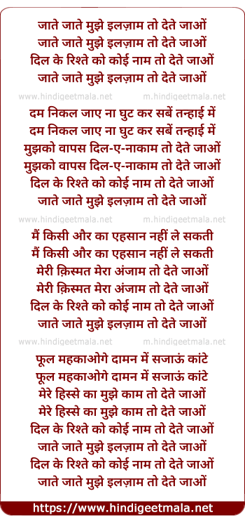 Lyrics of Jaate Jaate Mujhe Ilzaam To Dete Jao - जाते जाते मुझे इलज़ाम तो देते जाओं