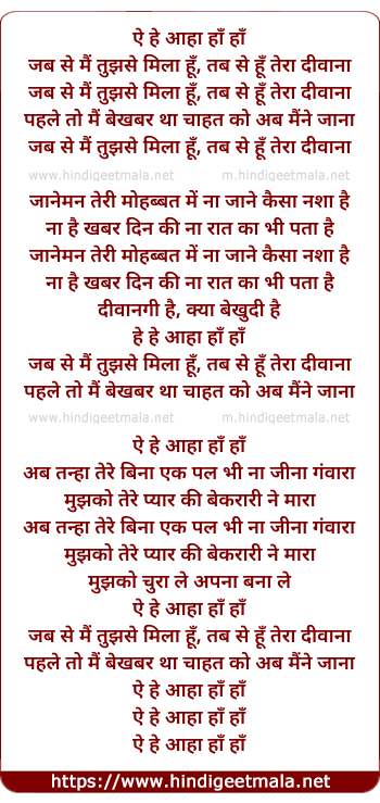 Lyrics of Jab Se Main Tujhse Mila Hoon - जब से मैं तुझसे मिला हूँ