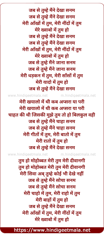 Lyrics of Jab Se Tumhe Maine Dekha Sanam Meri Aankho Me Tum - जब से तुम्हे मैंने देखा सनम मेरी आँखों में तुम