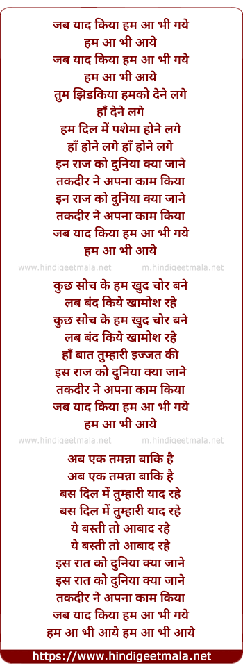 Lyrics of Jab Yaad Kiya Hum Aa Bhi Gaye - जब याद किया हम आ भी गये
