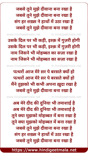 Lyrics of Jabse Tune Mujhe Divaana Bana Rakha Hai - जबसे तूने मुझे दीवाना बना रखा है