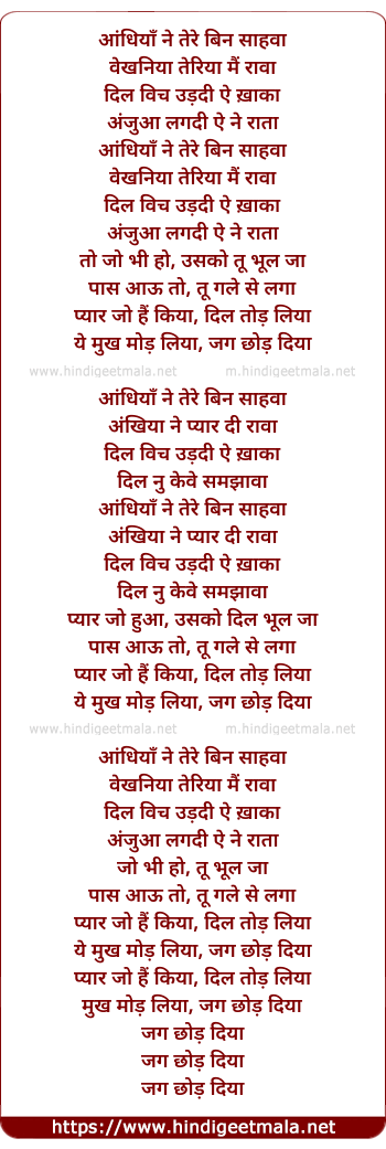 Lyrics of Jag Chhor Diyaa - आंधियाँ ने तेरे बिन साहवा