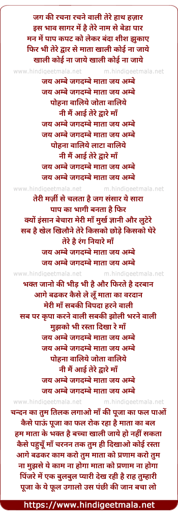 Lyrics of (Jag Ki Rachna), Jai Ambe Jagadambe Mata Jai Ambe Maa - (जग की रचना), जय अम्बे जगदम्बे माता जय अम्बे माँ