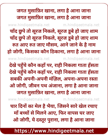 Lyrics of Jagat Musafir Khana Laga Hai Aana Jana - जगत मुसाफ़िर खाना लगा है आना जाना