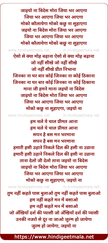 Lyrics of Jaiyyo Na Bides Mora Jiya Bhar Aayega - जाइयो ना बिदेस मोरा जिया भर आएगा