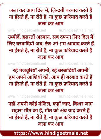 Lyrics of Jala Kar Aag Dil Me Zindagi Barbad - जला कर आग दिल में ज़िन्दगी बरबाद