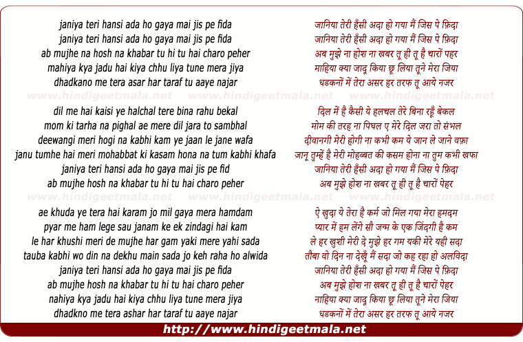Lyrics of Janiya Teri Hansee Ada - जानिया तेरी हँसी अदा
