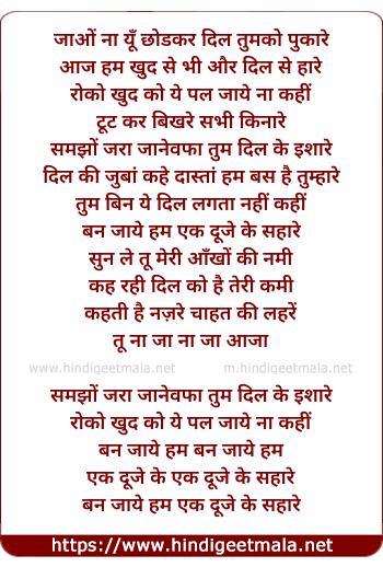 Lyrics of Jao Na Yun Chodkar Dil Tumko Pukaare - जाओं ना यूँ छोडकर दिल तुमको पुकारे