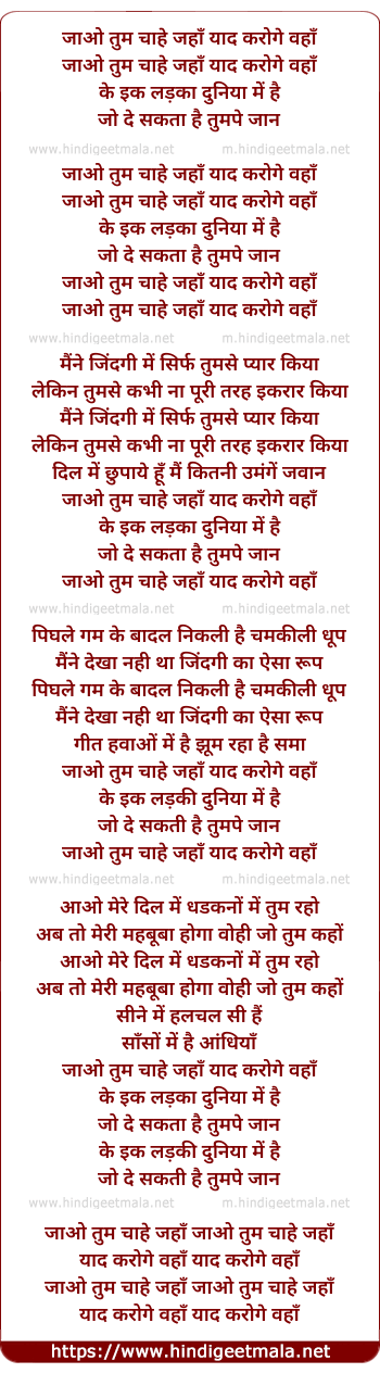 Lyrics of Jao Tum Chahe Jahan - जाओ तुम चाहे जहाँ