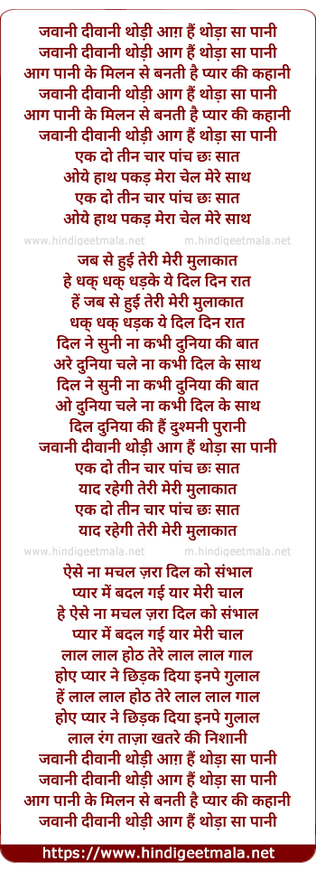 Lyrics of Jawani Deewani Thodi Aag Hai - जवानी दीवानी थोड़ी आग़ हैं थोड़ा सा पानी