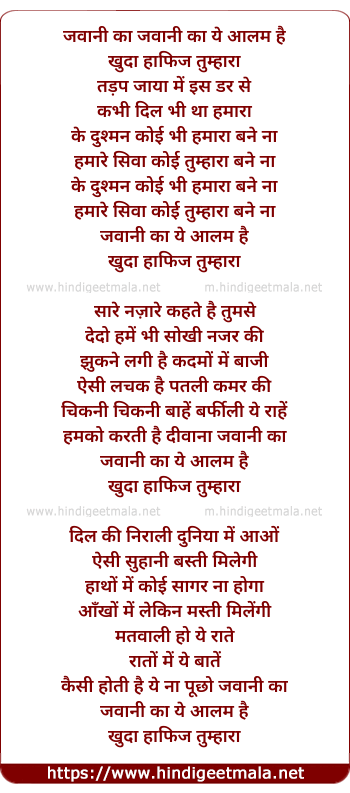 Lyrics of Jawani Ka Yeh Alam Hai, Khuda Ahafij Tumhara - जवानी का ये आलम है, खुदा हाफिज तुम्हारा