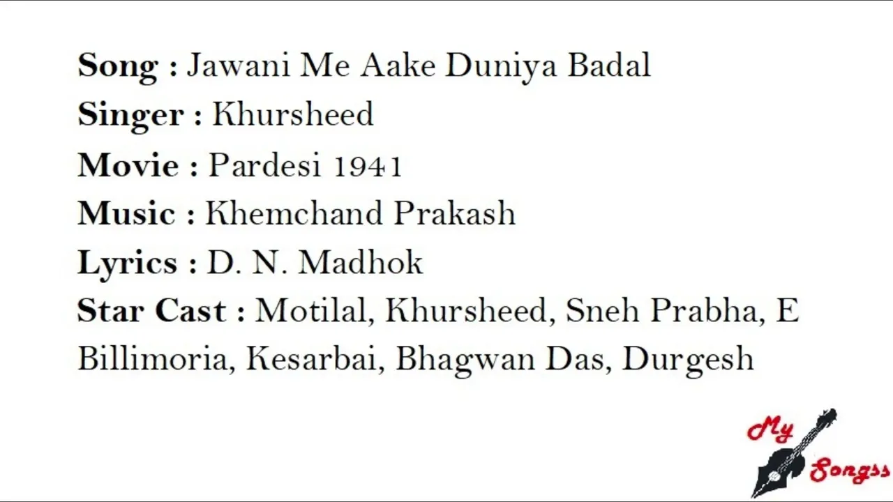 Film CastMotilal, Khursheed, Sneh Prabha, E Billimoria, Kesarbai, Bhagwan Das, Durgesh