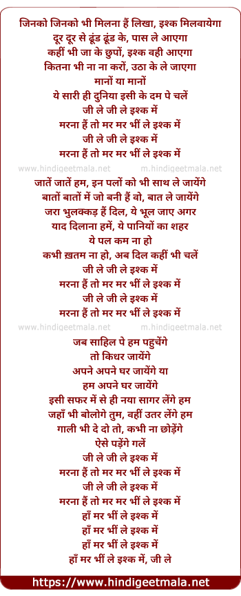 Lyrics of Jee Le Jee Le Ishq Me - जी ले जी ले इश्क में