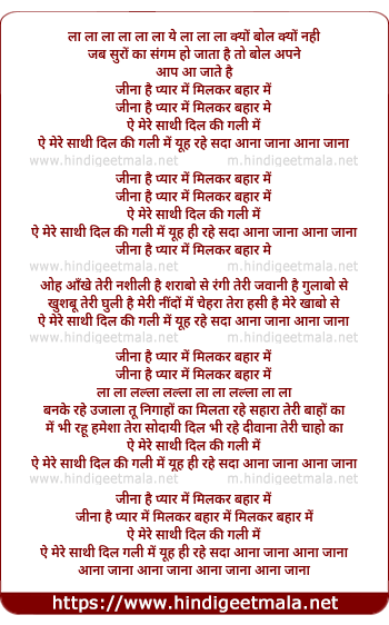 la la la la la la ye la la la kyu bol kyu nhi jab suro ka sangam ho jata hai toh bol apne aap aa jate hai jeena hai pyar mein milakr bahar mein jeena hai pyar mein me milkar bahar me ae mere saathi dil ki gali mein ae mere saathi dil ki gali me yuh hi rhe sada aana jana aana jana jeena hai pyar me milkar bahar mein jeena hai pyar mein milkar bahar mein ae mere saathi dil ki gali mein ae mere saathi dil ki gali mein yuh hi rhe sada aana jana aana jana jeena hai payr me milakr bahar mein oh aankhe teri nasili hai sharabose rangi teri jawani gulabo se khushboo teri ghuli hai meri nindo mein chehra tera hasi hai mere khabo se ae mere saathi dil ki gali mein yuh hi rhe sada aana jana aana jana jeena hai pyar mein milkar bahar mein jeena hai pyar mein milkar bahar mein la la laala laala la la laala la la banke rahe ujala tu nigaho ka milta rhe sahara teri baho ka mein bhi rahu hamesha tera sodayi dil bhi rahe diwana teri chaho ka ae mere saathi dil ki gali mein ae mere saathi dil ki gali mein yuh hi rhe sada aana jana aana jana jeena hai pyar mein milkar bahar mein jeena hai pyar mein milkar bahar mein ae mere saathi dil ki gali me ae mere saathidil ki gali mein yuh hi rhe sada aana jana aana jana aana jana aana jana aana jana aana jana