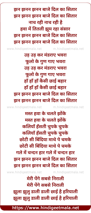 Lyrics of Jhan Jhanan Baje Dil Ka Sitar - झन झनन बाजे दिल का सितार