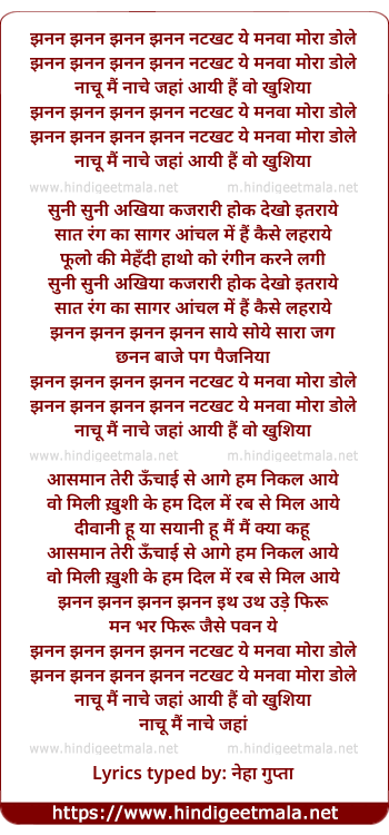 Lyrics of Jhanan Jhanan Natkhat Yeh Manwa - झनन झनन नटखट ये मनवा