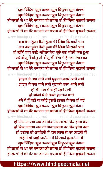 Lyrics of Jhoom Bindiya Jhoom Kajara - झूम बिंदिया झूम कजरा