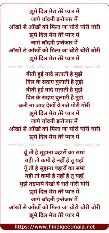 Lyrics of Jhoome Dil Mera Tere Pyar Me - झूमे दिल मेरा तेरे प्यार में