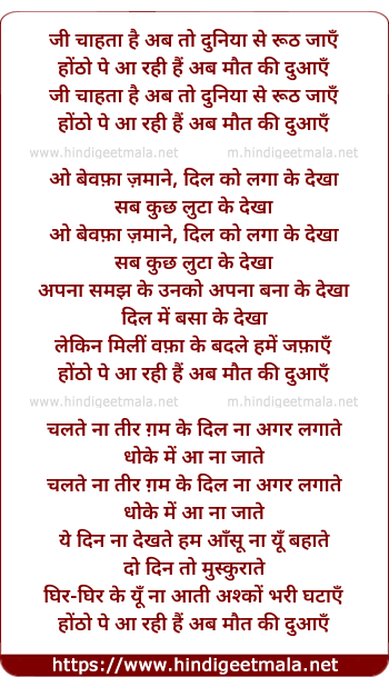 Lyrics of Ji Chaahataa Hai Ab To Duniyaa Se Ruth Jaaen - जी चाहता है अब तो दुनिया से रूठ जाएँ