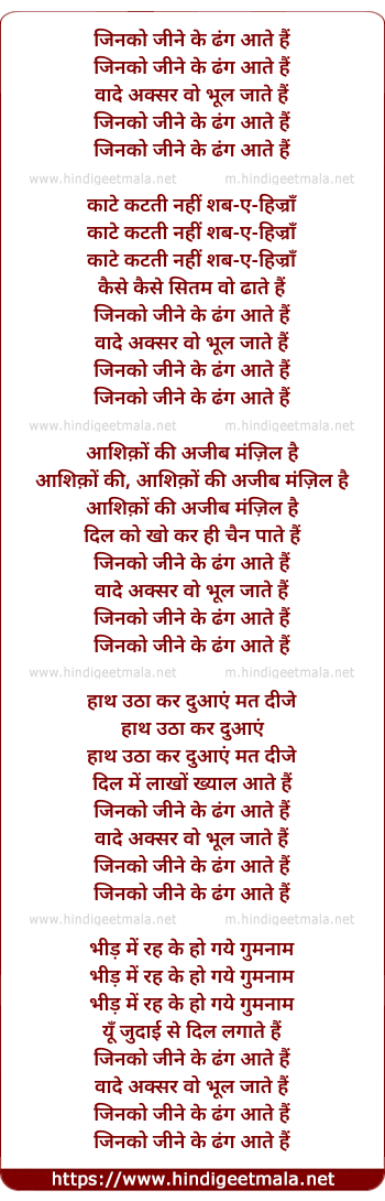 Lyrics of Jinako Jine Ke Dhang Aate Hain - जिनको जीने के ढंग आते हैं