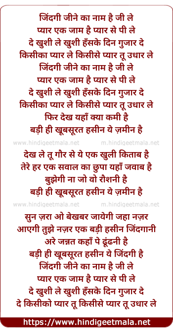 Lyrics of Jindagi Jine Ka Nam Hai Ji Le - जिंदगी जीने का नाम है जी ले