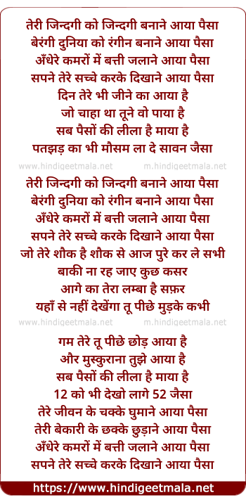 Lyrics of Jindgi Ko Jindgi Banane Aaya Paisa - जिन्दगी को जिन्दगी बनाने आया पैसा