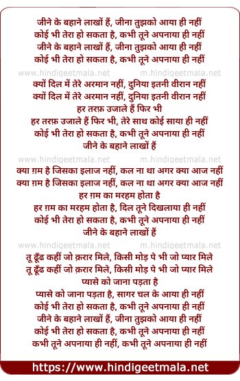 Lyrics of Jine Ke Bahane Laakho Hain - जीने के बहाने लाखों हैं