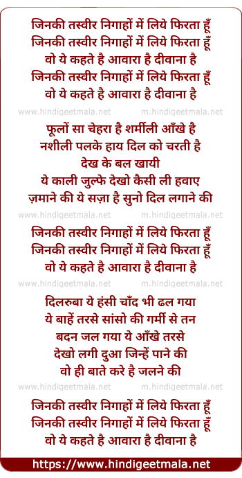 Lyrics of Jinki Tasvir Nigaho Me Liye Phirta Hu - जिनकी तस्वीर निगाहों में लिये फिरता हूँ