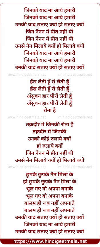 Lyrics of Jinko Yaad Na Aaye - जिनको याद ना आये हमारी