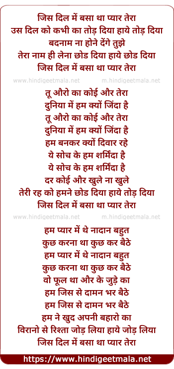 Lyrics of Jis Dil Me Basa Tha Pyar Tera - जिस दिल में बसा था प्यार तेरा