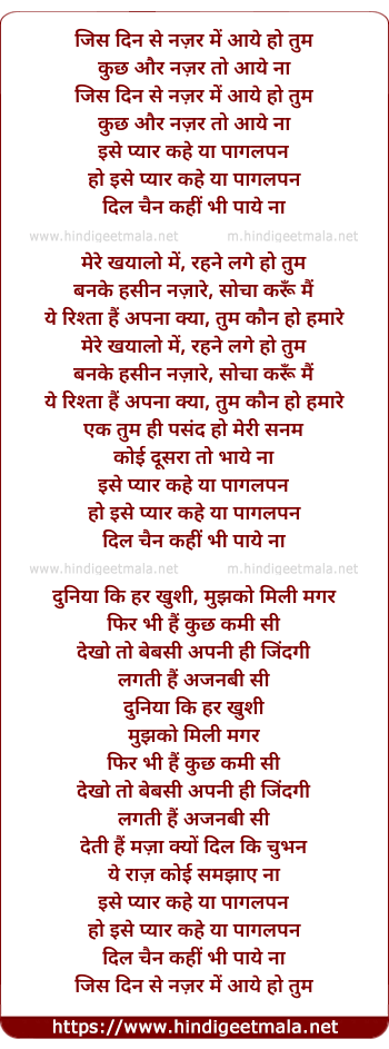 Lyrics of Jis Din Se Nazar Aaye Ho Tum - जिस दिन से नज़र में आये हो तुम
