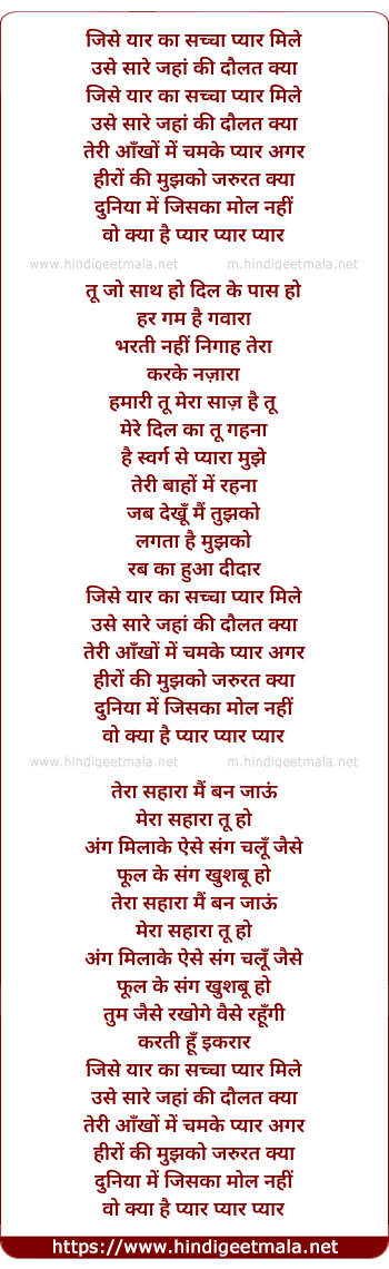 Lyrics of Jise Yaar Ka Sachha Pyar Mile - जिसे यार का सच्चा प्यार मिले