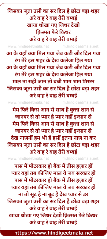 Lyrics of Jiska Juta Usika Sar Dil Hai Chhota Bada Shahar - जिसका जूता उसीका सर दिल है छोटा बड़ा शहर