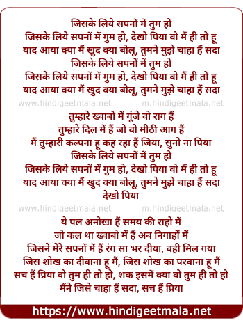 Lyrics of Jiske Liye Sapano Mein Tumm Ho - जिसके लिये सपनों में तुम हो
