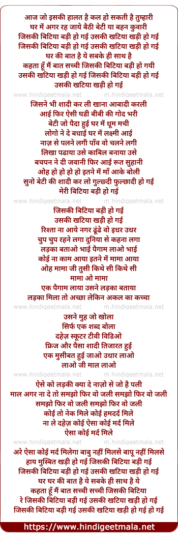 Lyrics of Jiski Bitiya Badi Ho Gayi - जिसकी बिटिया बड़ी हो गई