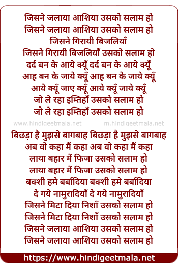 Lyrics of Jisne Jalaya Aashiya - जिसने जलाया आशिया उसको सलाम हो