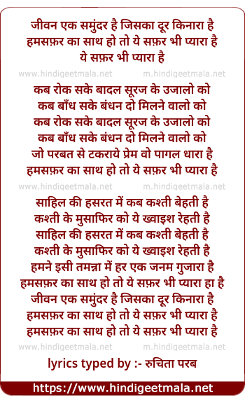 Lyrics of Jivan Ek Samundar Hai Jiska Dur Kinara Hai - जीवन एक समुंदर है जिसका दूर किनारा है